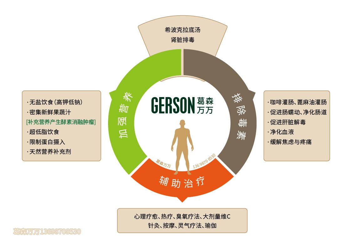 葛森疗法是一套科学的、系统的代谢疗法。它通过精准的营养干预,排除身体毒素,修复受损的人体细胞,矫正和强化器官功能,改善并平衡新陈代谢,从而达到复原和活化免疫系统,重启并增强自愈能力的目的。葛森疗法为了复原和重新活化一切身体系统而设计,能够特别强化人体的免疫系统、酵素系统、荷尔蒙系统,以及矫正所有器官的功能,让身体进入恒定状态。